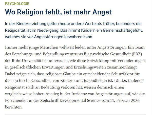 Religiöser Glaube ist laut einer aktuellen Untersuchung der Ruhr-Universität Bochum (RUB) ein wesentlicher Schutzfaktor für die psychische Gesundheit von Kindern und Jugendlichen.